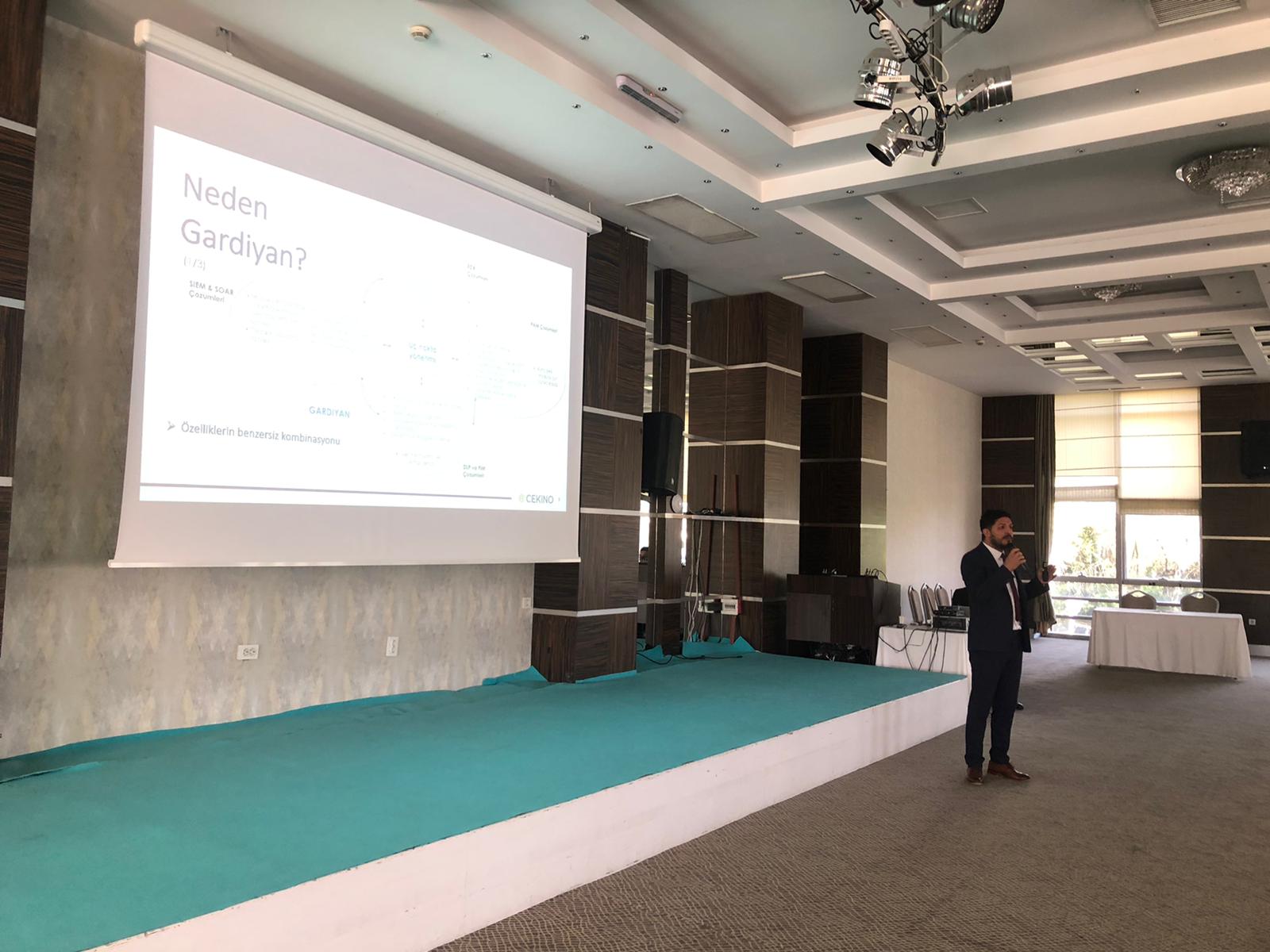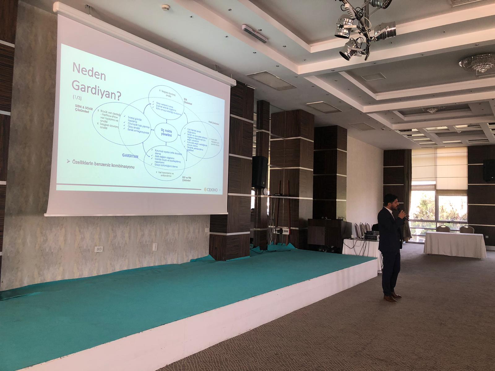 Program, Çekino Bilgi Teknolojileri A.Ş.CEO’su Erol Yılmaz’ın Gardiyan (Muhafız) ürün sunumuyla devam etti. Yılmaz, DMO Tekno Katalogda da yer alan Gardiyan ürünü hakkında detaylı bir sunum yaptı. Gardiyan ürününün, geniş çalışma ağlarında tüm sistemin izlenmesini, yönetilmesini ve gerektiğinde kurumsal politikalar doğrultusunda sistem yöneticilerinin bilgilendirilmesini sağlayan bir sistem operasyon yönetim yazılımı olduğunu dile getirdi. Erol Yılmaz ayrıca Gardiyan’ın, sunduğu geniş kapsamı ve modüler yapısı ile kurumları birden fazla yazılım ve program ihtiyacından kurtardığının ve kurum içindeki süreçlerin güvenli bir şekilde yönetilmesini sağladığının altını çizdi.
