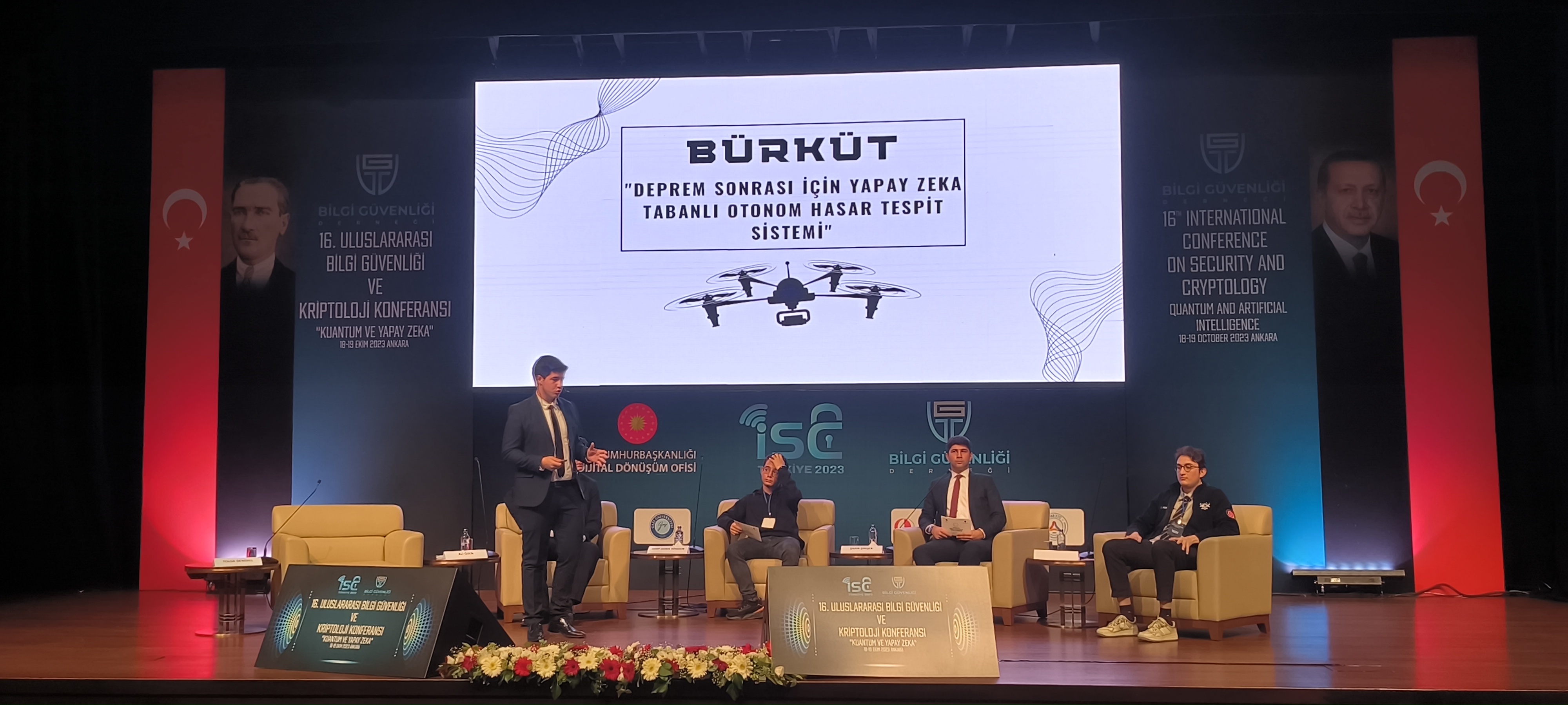 Gazi Üniversitesi Bilgisayar Mühendisliği öğrencileri Tolga Demirel ve Ali Özen, kendilerinin geliştirdiği Bürküt ürününü tanıttı. Deprem ülkesi olduğumuz gerçeğinden yola çıkılarak geliştirdiklerini belirten Demirel ve Özen yapay zekâ tabanlı otonom hasar tespit sistemi olduğunu vurguladı.