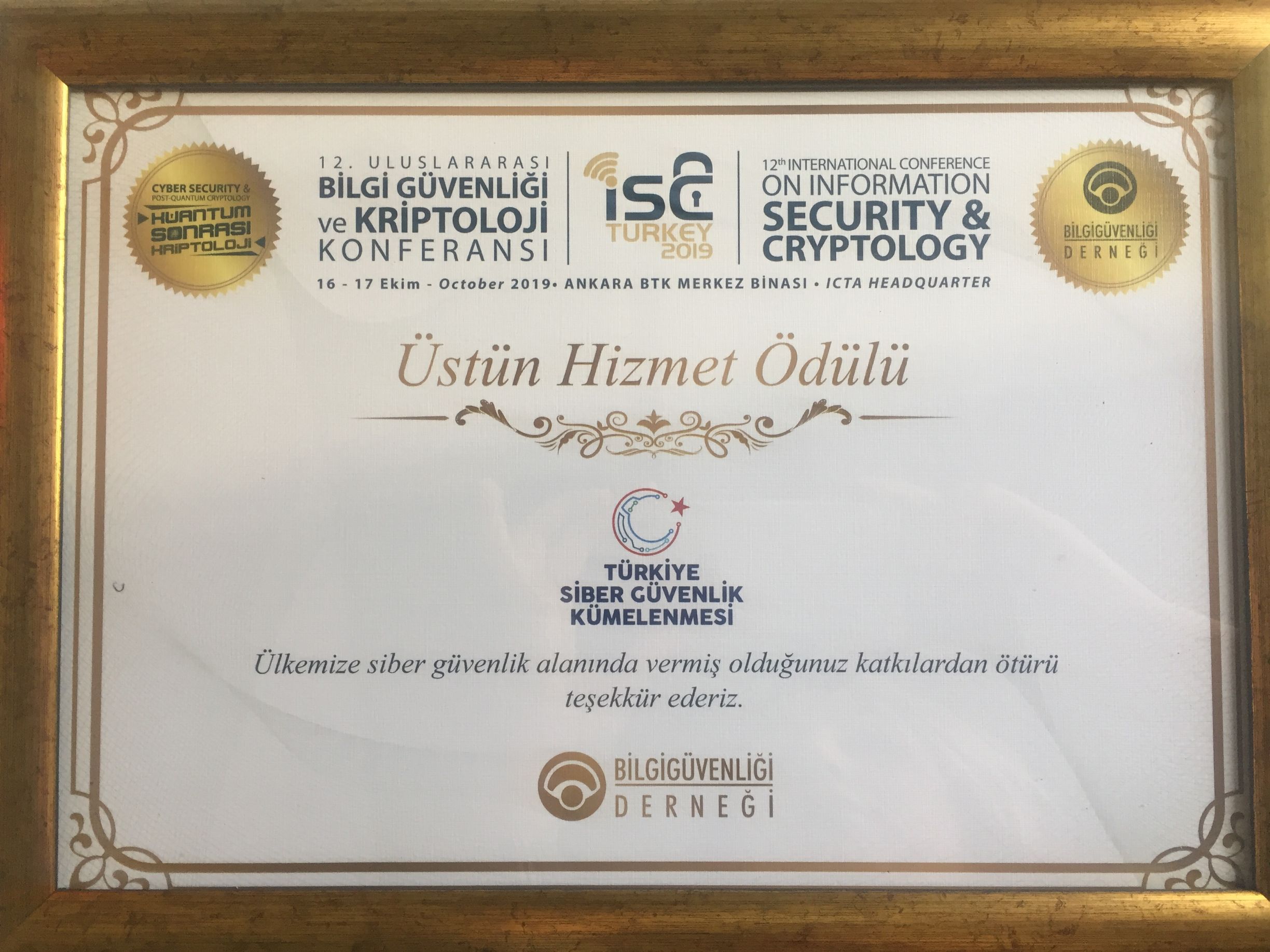 Bilgi Güvenliği Derneği tarafından düzenlenen 12. Uluslararası Bilgi Güvenliği ve Kriptoloji Konferansında, ülkemizde siber güvenlik ekosisteminin oluşturulması ve yaygınlaştırılması, üniversite öğrencilerinin siber güvenliğe ilgisinin artırılması için toplulukların desteklenmesi, yarışmalar yapılması, sektörün sağlıklı olarak büyümesi ve gelişmesine katkı sağlayacak projelerin desteklemesi ve ülkemize siber güvenlik alanında verilen katkılardan ötürü, T.C. Ulaştırma ve Altyapı Bakanı Sn. Mehmet Cahit TURHAN tarafından Türkiye Siber Güvenlik Kümelenmesi’ne Üstün Hizmet Ödülü verildi. Ödülü Türkiye Siber Güvenlik Kümelenmesi adına Savunma Sanayii Başkanlığı Siber Güvenlik ve Bilişim Sistemleri Grup Başkanı Mustafa ÖZÇELİK aldı.