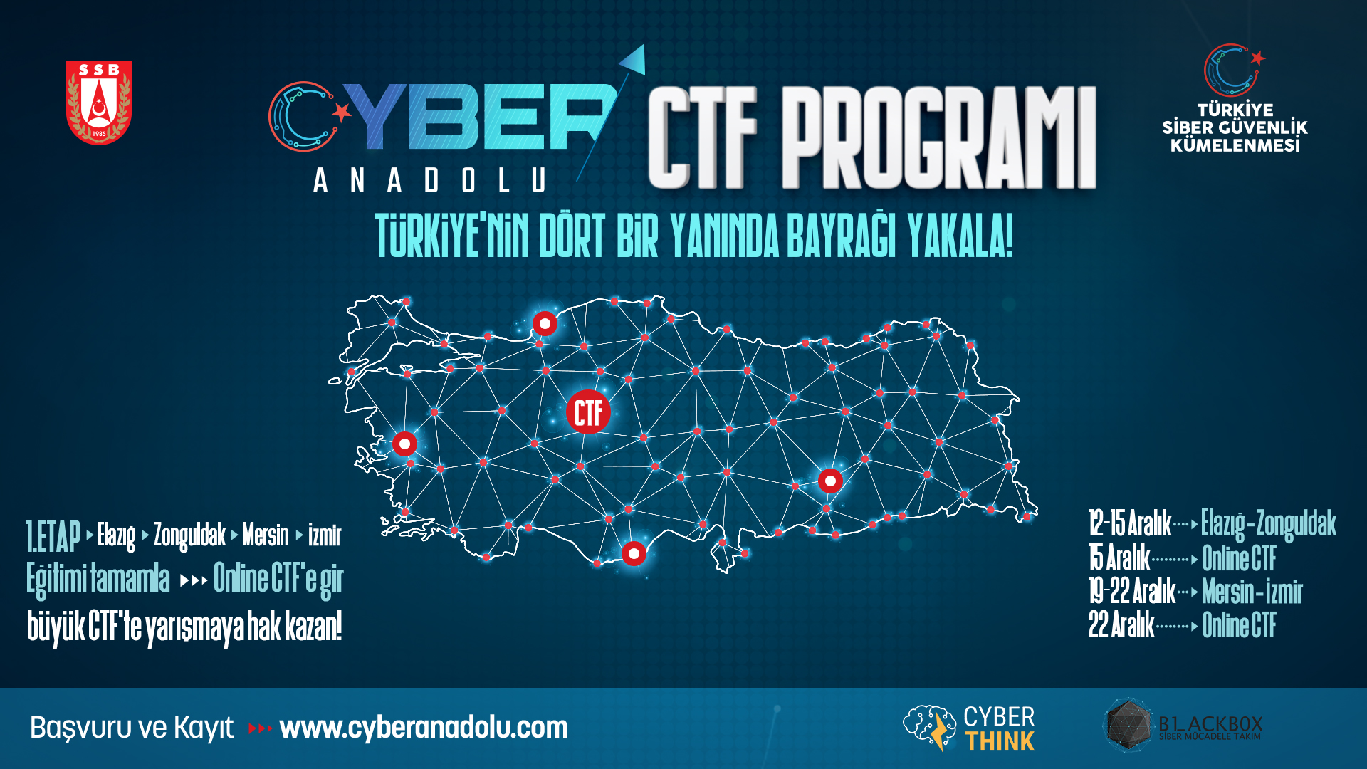 1.etabı Elazığ-Zonguldak-Mersin ve İzmir’den oluşan Cyber Anadolu’da Elazığ ve Zonguldak katılımcıları 4 günlük siber güvenlik eğitiminin ardından CTF’te (Capture The Flag / Bayrağı Yakala) yarıştılar. CTF sonunda başarılı olan ilk 4 kişi şehrinin takımında yer almaya ve Haziran 2020’de Ankara’da düzenlenecek CTF Finalinde şehrini temsil etmeye hak kazandı.