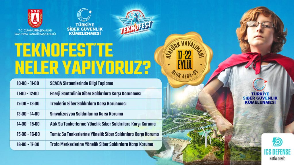 Endüstriyel Kontrol Sistemlerine yönelik siber güvenlik önlemleri ICS Defense firmasının katkılarıyla TEKNOFEST Istanbul boyunca her gün Siber Küme standında sizleri bekliyor!