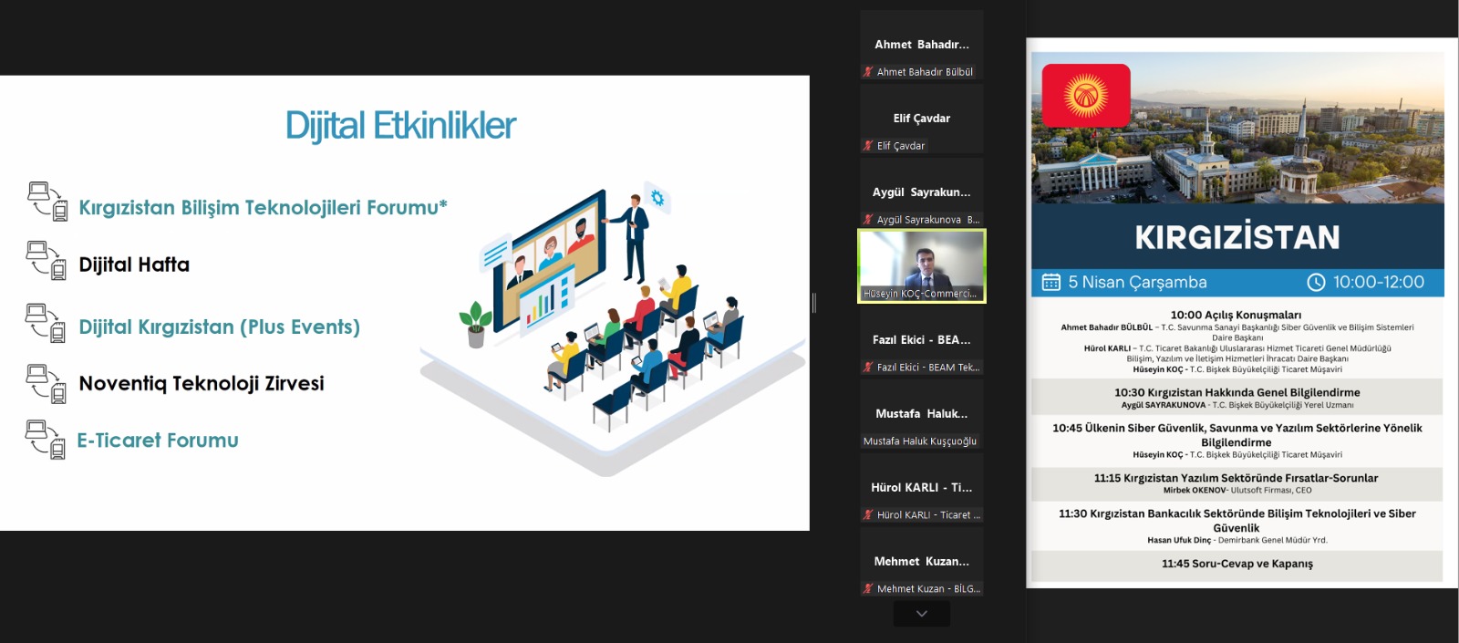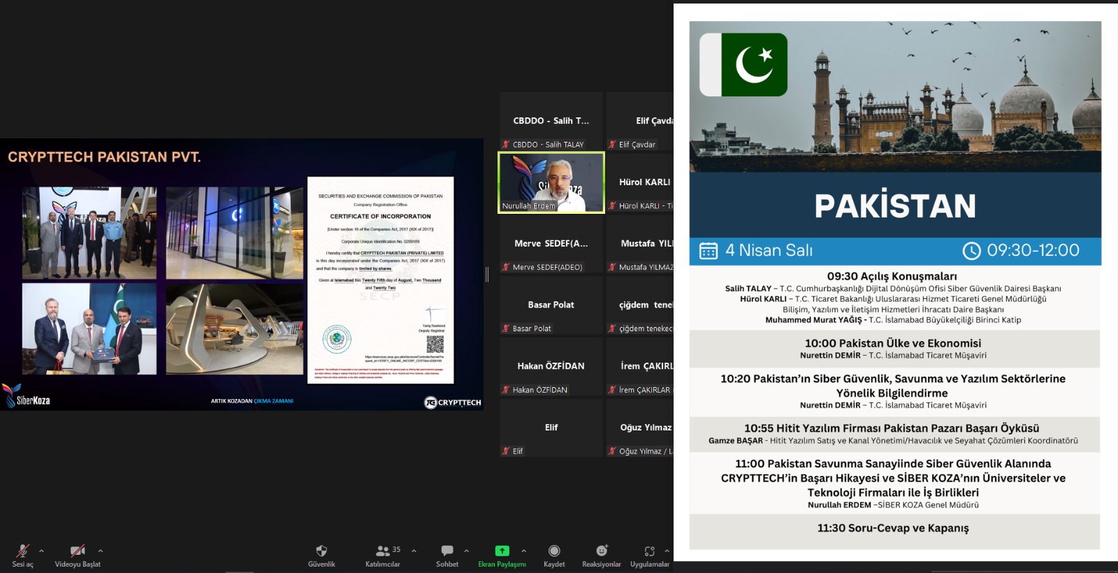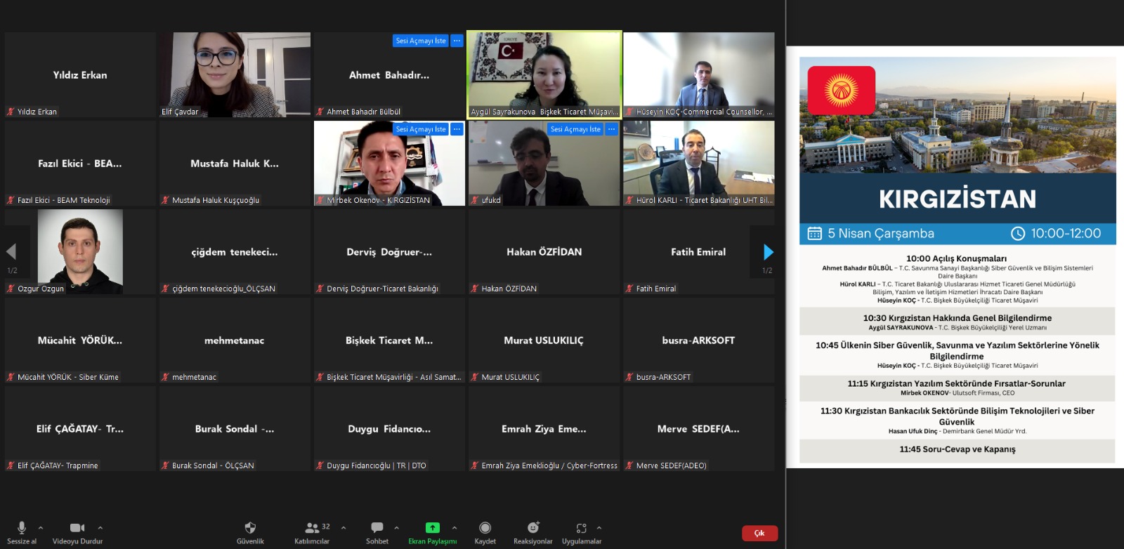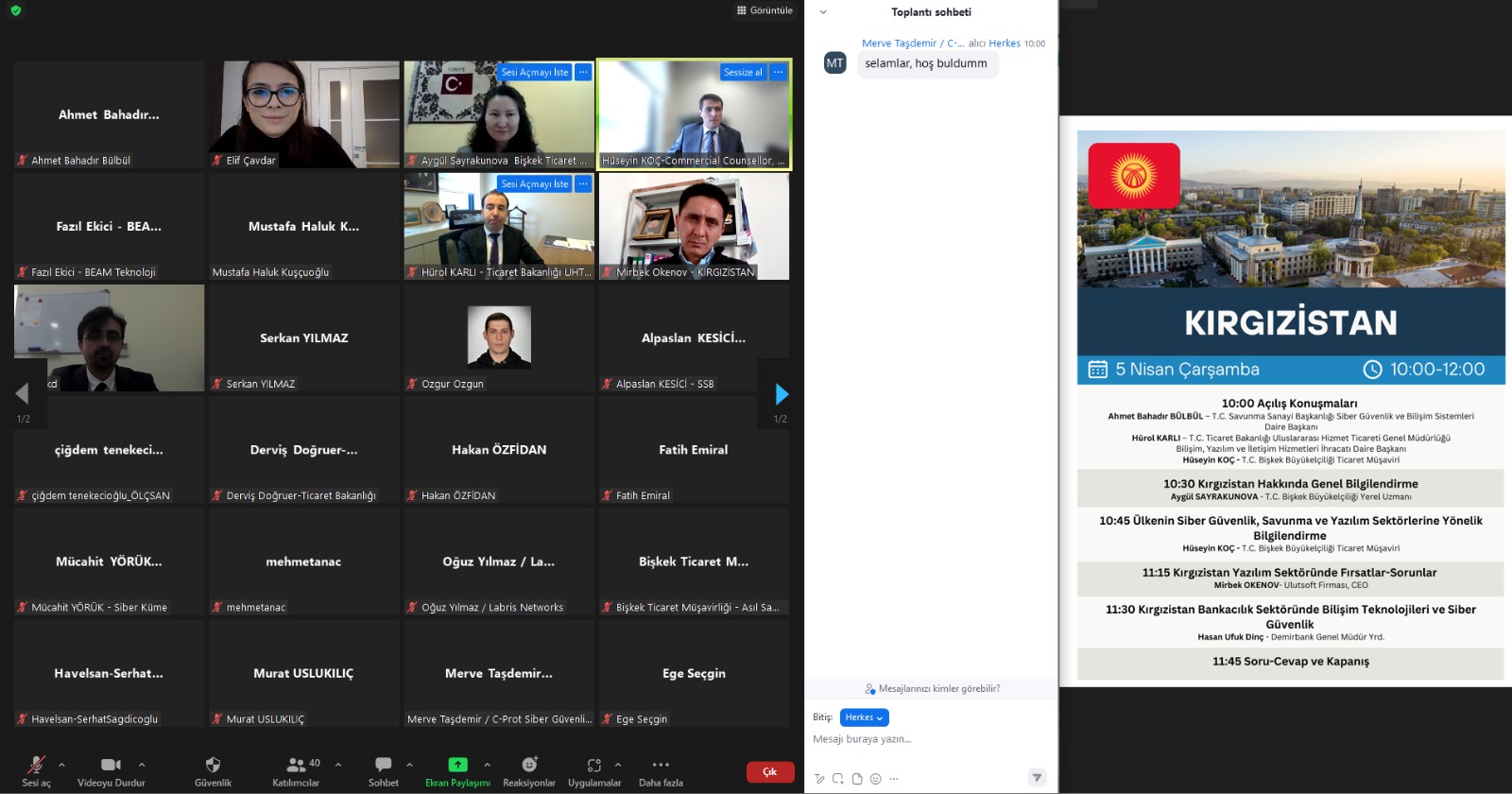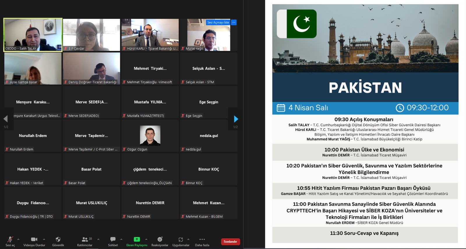Türkiye Siber Güvenlik Kümelenmesi, bu hafta iki ayrı çevrim içi etkinlik düzenleyerek üyelerini Pakistan ve Kırgızistan’da ticari ortam, iş yapma alışkanlıkları, pazar dinamikleri, şirket kurulumu ve destek mekanizmaları, start-up ekosistemi, bilişim firmaları için fırsatlar hakkında bilgilendirdi.