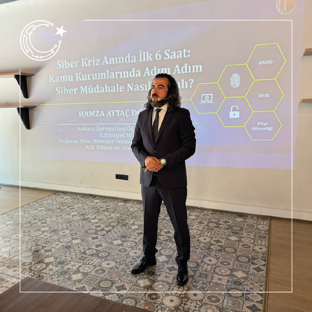 Ankara Üniversitesi Öğretim Görevlisi, E. Emniyet Müdürü ve Doğanay Siber Emniyet Teknolojileri firması kurucusu Hamza Aytaç DOĞANAY "Siber Kriz Anında ilk 6 Saat: Kamu Kurumlarında Adım Adım Siber Müdahale Nasıl Olmalı?" konulu sunum gerçekleştirmiştir. Sayın DOĞANAY sunumunda;